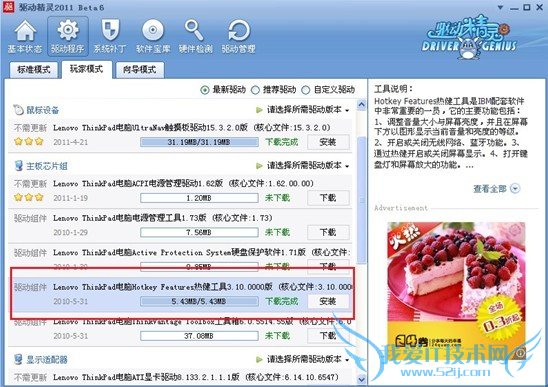没办法,必须得用驱动精灵了。精灵扫描了一遍提示驱动正常,但是建议装一些IBM笔记本驱动组件,其中有一项很引人注意---Lenovo ThinkPad电脑Hotkey Features热键工具。想到笔记本大都有快捷键控制声卡的开关,想必必须装这个热键工具才能启用声卡。
