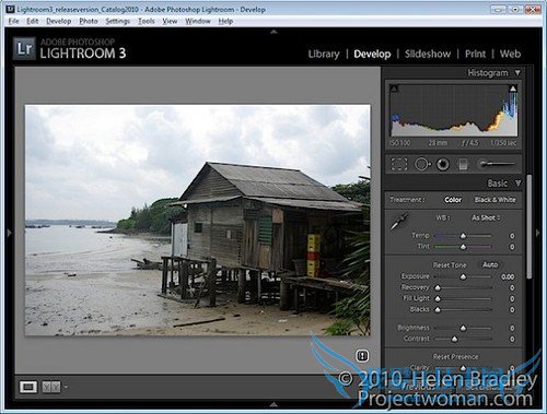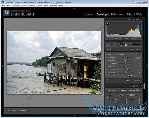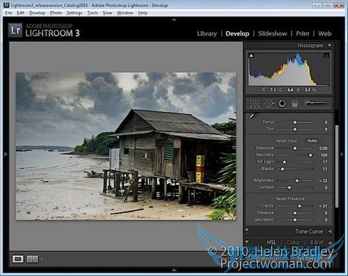 在Develop(修改照片)(译者注:括号是Lightroom 3简体中文版中的名称,下同。)模块下,首先使用Basic(基本)面板下的各项设置对照片进行全局调整。这一步中,主要关注那些在Adjustment Brush(调整画笔)和Graduated Filter(渐变滤镜)面板中无法调整的内容,例如Blacks(黑色色阶)、Fill Light(补光效果)、Recovery(高光修正)和Vibrance(鲜艳度)。