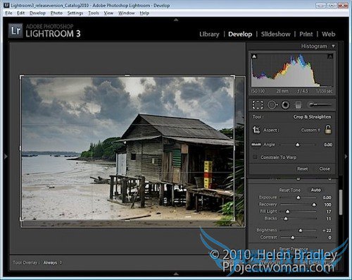 这一步中,我对照片进行了裁切,将右边多余的细节裁掉。这张照片的趣味中心是水和小屋,右边的细节是多余的。