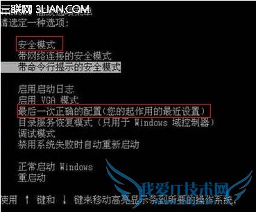 2. 如果蓝屏报错代码非方案1的报错信息,请重新启动计算机,重启后不停地快速敲击F8键直到出现系统菜单(如下图),选择最近一次正确配置登陆看是否能正常使用,如果可以进入到系统通常就可以正常使用了。
