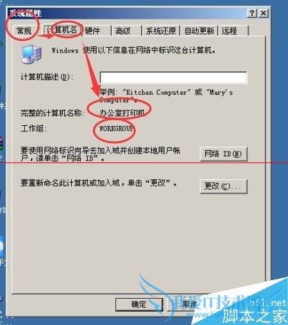 2).默认是常规-点击 计算机名-在这里你看到A电脑名字为:办公室打印机,工作组为:Workgroup(如图二所示)