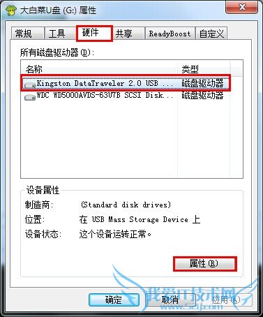 5.在打开的属性窗口,切换到硬件项,点击打开属性(R)。如下图所示