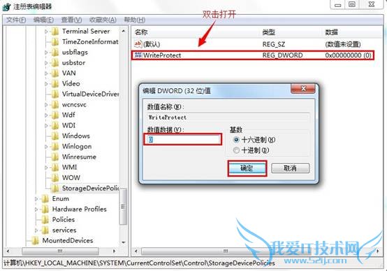 3. 在右侧窗口中找到“ WriteProtect ”表,双击打开WriteProtect将数值数据改为“0”结束操作。如下图所示