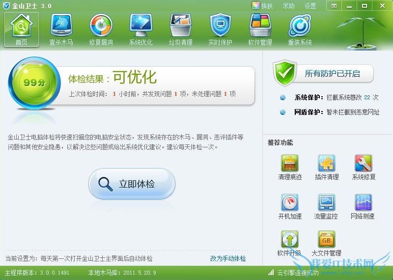 一般用户重装系统,文件备份、重装软件,但都不是三五分钟就能搞定的,推荐使用金山卫士无需繁琐操作就能解决C盘空间不足的问题。 首先使用金山卫士检查电脑是否中毒