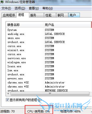 首先我们打开任务管理器,然后切换到cpu行列,对占用cpu的出程序逐一排查,查看哪个cpu程序占用的cpu忽高忽低的情况。找到占用cpu不稳定的进程将其结束掉(不是系统进程的前提下),如果发现时系统进程不能结束的话,那就系统的问题了。