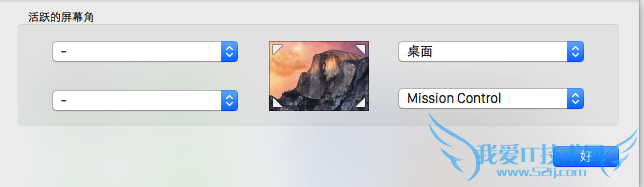 在弹出的触发角设置面板上,如何设置就一目了然了。用户可以通过下拉列表选择分别对屏幕的四个角落进行设置,可以设置的功能有:Mission Control、应用程序窗口(显示某应用当前所有窗口)、显示桌面、Dashboard、Launchpad、启动/停用屏幕保护程序、将显示器置入睡眠状态。
