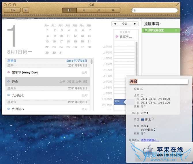 欢迎您访问我爱IT技术网,今天小编为你分享的电脑教程是日常使用电脑方面的电脑常识:Mac OS X Lion系统内置 iCal 日历里快速添加日程的方法,学会并运用这些电脑常识,让你快速玩转电脑及互联网方面的知识,下面是详细的分享!