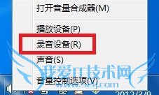 1. 在控制面板中打开“声音,点击录音或直接右击任务栏中的小喇叭选择录音设备;