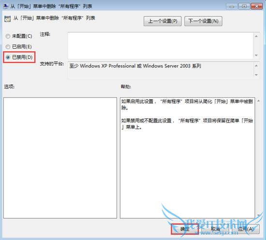 双击“从开始菜单中删除所有程序”,在编辑窗口点选“已禁用”,然后点击下方的“确定”,如图所示: