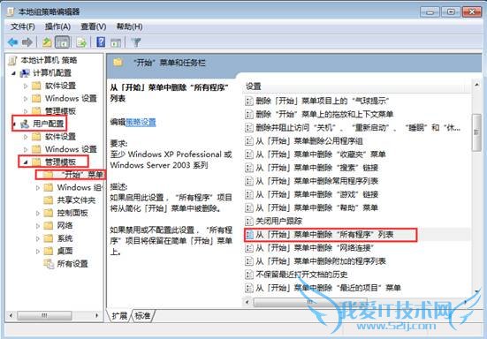 在本地组策略编辑器中,依次展开“用户配置——管理模块——开始菜单和任务栏”,并在右侧找到“从开始菜单中删除所有程序”,如图所示: