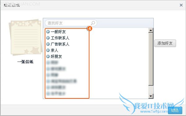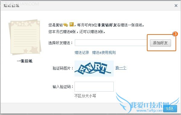 第三步、从您的好友列表上选择您需要赠送信纸的好友,之后输入验证码,再点击“赠送”即可(当您赠送好友信纸后,您的好友获的是使用黄钻信纸的资格。若您的好友需要使用信纸时,可在编辑日志中任选一张黄钻使用的信纸来使用)。