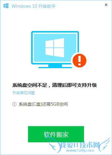 如果检测不通过则会有相应提示;如果系统盘空间不足可通过电脑管家“软件搬家”功能进行扩充空间;