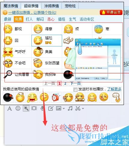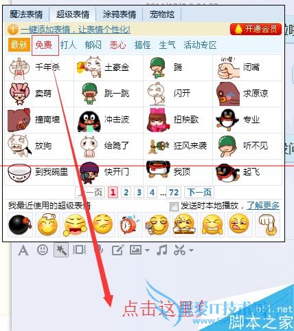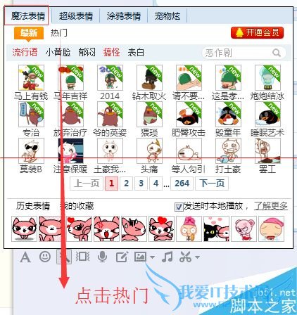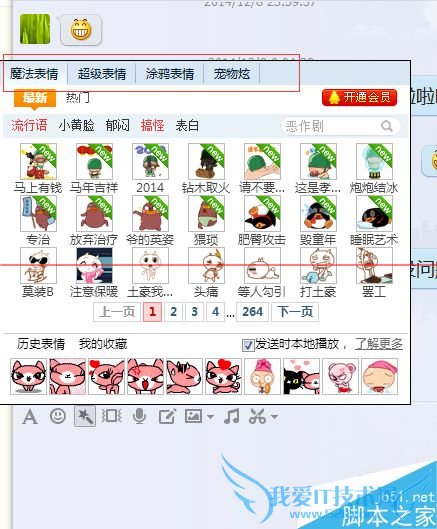 2、点击魔法表情按钮,就能打开魔法表情选择框。可以看到,一共有四个选项卡。分别是魔法表情、超级表情、涂鸦表情和宠物炫。