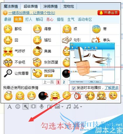 6、点击某一个表情就可以给好友发送了。每个超级表情都有一些动画效果。发送时下边有一个选项,可以选择发送时本地播放。如果勾选,每次给好友发送表情,你的电脑屏幕上也会播放表情动画。