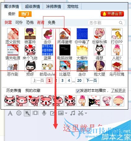 7、使用免费魔法表情的方法也是如此。选择上面选项卡中的魔法表情,就可以看到很多魔法表情。上面有最新和热门两个选项。点击热门,可以看到下面列出五中分类,最后一种就是免费。