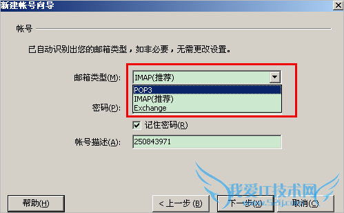 2、选择邮箱帐号类型是:pop、imap或exchange;