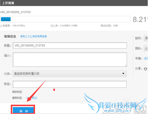在视频上传完后,在新出现的页面中,逐一按要求填写简介,标签后,点击“保存”。在这里您还可以根据视频的私密性选择公开或者隐藏。
