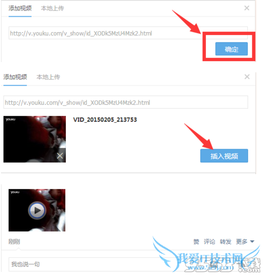 将优酷视频的地址粘贴到“添加视频”下方的框里,然后点击确定。出现“插入视频”,点击后,继续点击“发表”即可插入视频。现在就可以点开视频中的三角看视频啦。