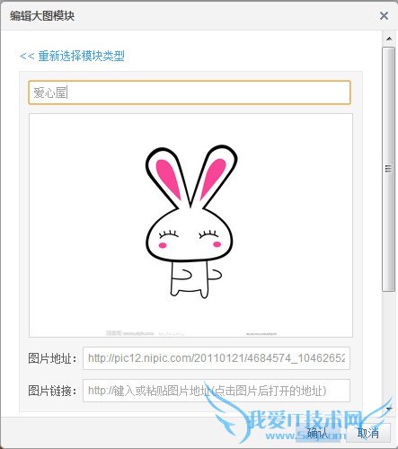 第四步:在打开的“大图模块”窗口中输入图片的标题以及图片地址,然后点击“确定”按钮。(由于选择的这张图片太大,所以换了张,请见谅哦)