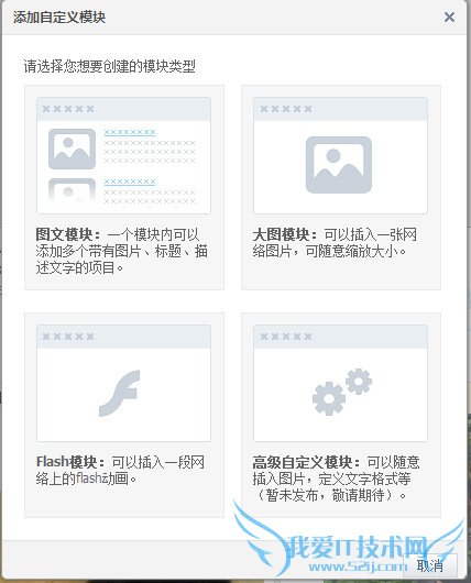 第三步:在打开的“添加自定义模块”窗口中,选择一种与自己需求相适合的模块类型,在此小编我选择“大图模块”。