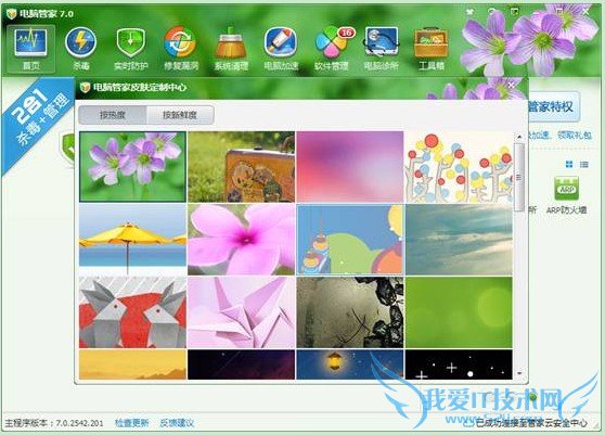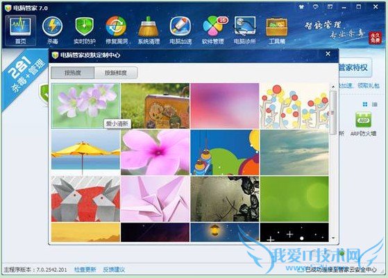 方法一:单击管家主界面的皮肤按钮,在打开的对话框中选中“更多皮肤”即可跳转电脑管家皮肤定制中心,可以看到每套皮肤的局部预览图。点击皮肤缩略图即可看到立即更换新皮肤。