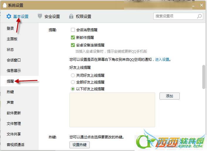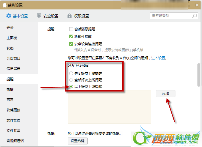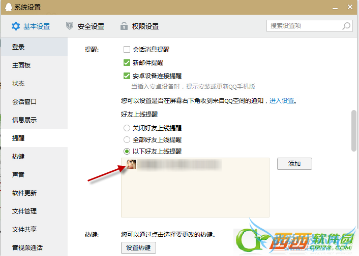 4、可以看到有个好友上线提醒,您选择以下好友上线提醒,点击添加