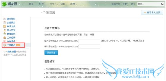 朋友网支持设置个性域名啦!可以选择英文名、中文的拼音等来作为个性域名,彰显个性,方便记忆,更重要的是,你的朋友可以通过个性域名直接访问你的页面、日志、相册!