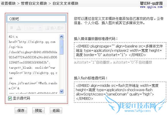 3)勾选上“显示源代码”,并将生成的代码粘贴至代码框内,并可自定义模块标题,如:Q我吧;