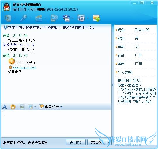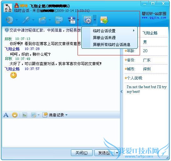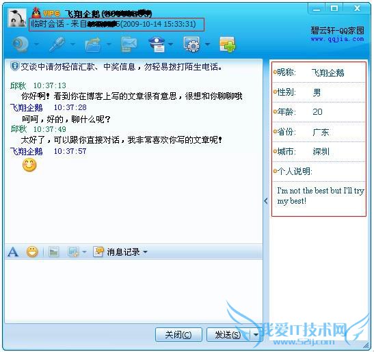1)聊天窗口上方出现临时会话来源及对象,侧边栏则会显示对方:昵称、性别、年龄、省份、城市及个人说明