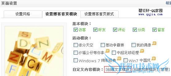 2)在“页面设置”中选择"设置博客首页模版",在其中"自定义内容模块"内选择"创建文本模块";