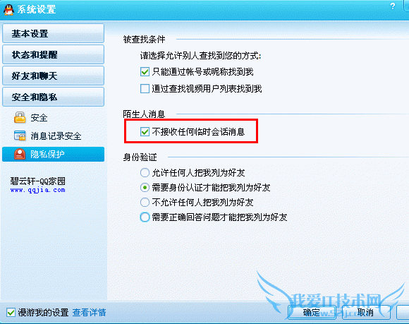点击菜单,进入“QQ系统设置”的“隐私保护”,把“不接收任何临时会话消息”前的勾去掉,所有的临时会话都接收不到,不是你的好友就无法和你聊天了。