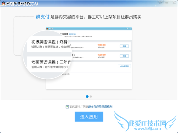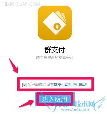 2、进入以后同意群支付协议然后点击【进入应用】继续。