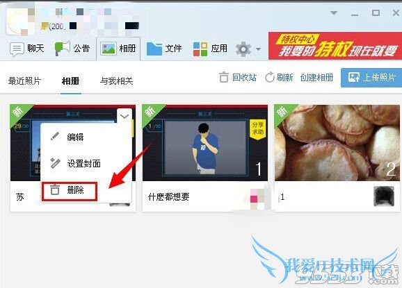 大家注意哦!别人上传在相册中的照片你是删除不了的,只能删除本人上传的照片,删除群里面相册只有群里面管理员和相册的创建人有权限删除掉相册,其它人都不能删除。上传人也只能删除自己 的照片。