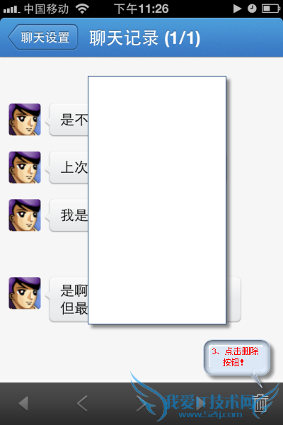 4、点击上图中的删除按钮,就可以删除iPhone QQ聊天记录了。
