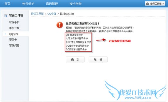 第二步:进入解绑QQ令牌页面,确定解绑QQ令牌对用户业务使用的影响,如果您确定无问题,请点击确定进行统一安全验证。