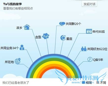 好友资料页新增“与我的故事”,打开好友的资料卡,点击左栏“与我的故事”,一道美丽的彩虹会出现在您眼前。所在地、故乡、血型、星座、共同群、Q龄……相同点越多,彩虹越完整。赶快来试试吧!