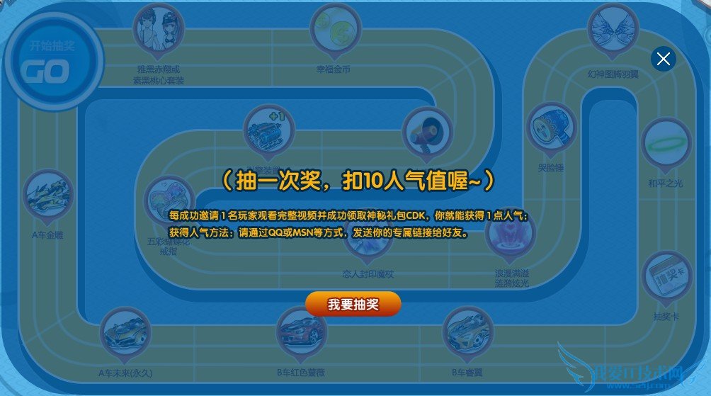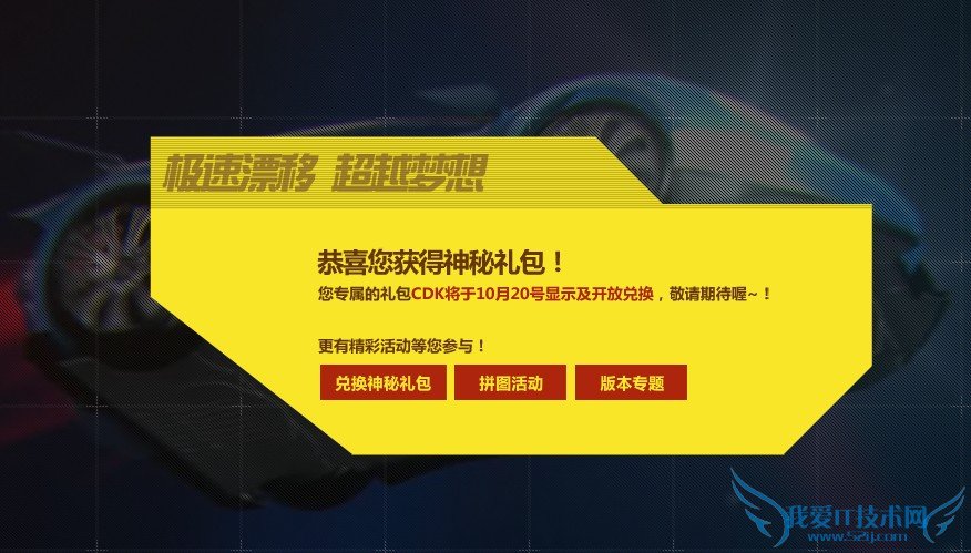 极速梦想,9月30日-10月20日给力大抽奖,观看《QQ飞车》极速梦想视频之后,就可获得神秘奖励,奖励的兑换CDK将在10月20日显示及开放兑换噢!点击弹出对话框中的“兑换神秘礼包”就可进入兑换界面,值得一提的是,抽奖的方式是以有着《QQ飞车》特色的赛道式抽奖噢!凭人气,拿奖励!人气越高,奖励越多越丰厚!