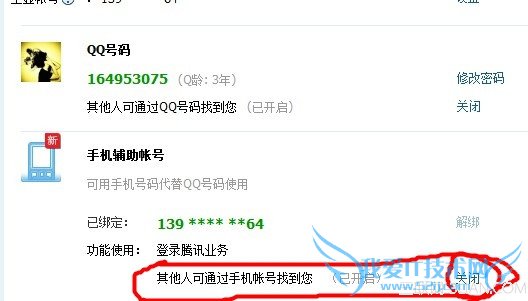 这里还需要设置一下,别人就可以通过手机号码直接查找你。并加你为好友。红色区域内,我这个是已经开通的了,所以大家看到的是关闭两个字。当然,没有开通的,你点一下开通,就会变成像我的这样。
