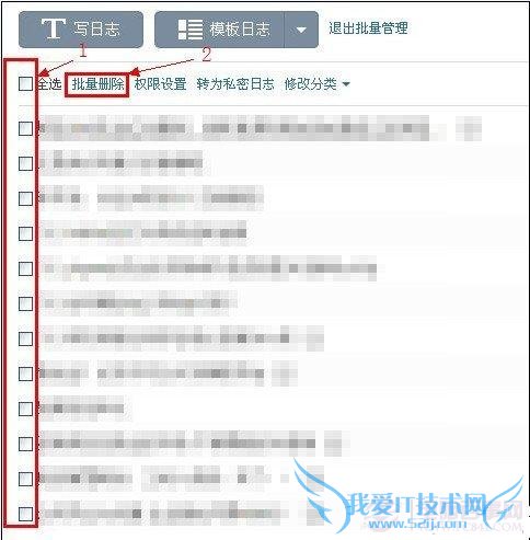 第三步:此时,每条日志的右边会多出一个复选框,勾选要删除日志前面的复选框或者勾选全选的复选框,再点击【批量删除】。