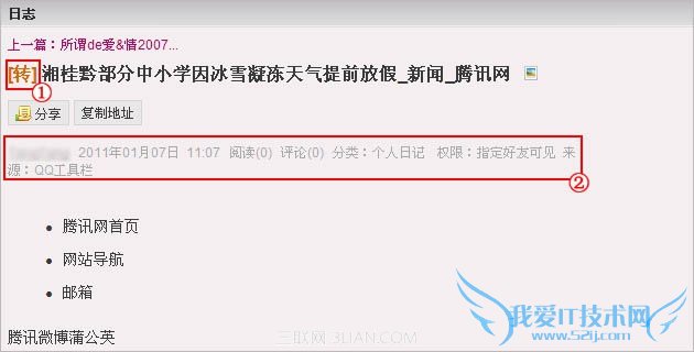 当您点击“转载到我的空间”之后,会直接进入您空间的该篇日志,日标题会显示“转”字(不能去除),另外会显示发日志的时间等,来源这里会显示“QQ工具栏”。如图: