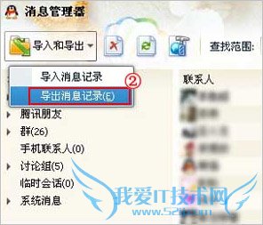 选择消息管理器界面左上角“导入和导出”按钮,选择导出消息记录,如图: