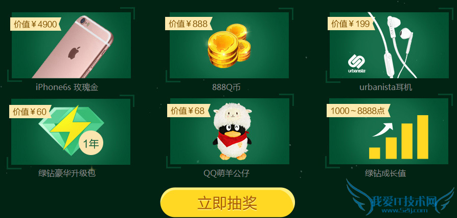 3.获得抽奖资格的用户,有机会抽中iPhone6S粉红色版(16G)、888Q币、urbanista耳机、1年豪华绿钻升级包、萌羊发声QQ公仔,1000~8888点绿钻成长值等奖品,100%中奖!