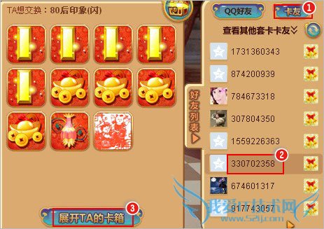 2、选择一位正在收集同套套卡的好友,然后“展开TA的卡箱”进行卡片交换,如下图: