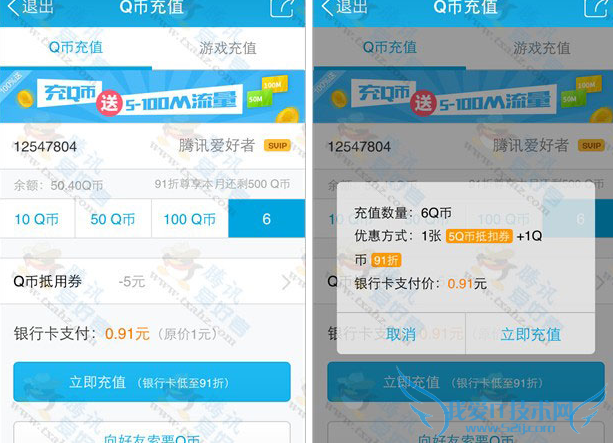 2、然后我们用抽到的Q币券去充值Q币,充值6Q币抵掉5元,再支付0.91元便可。