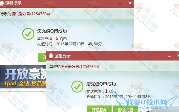 3、支付成功Q币秒到账,是分5Q币和1Q币两次到账的。