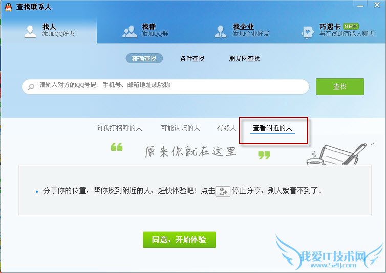 2.我们很容易看到在qq2013的查找界面比2012多了一项功能“查看附近的人”点击同意体验即可开始体验这一功能!