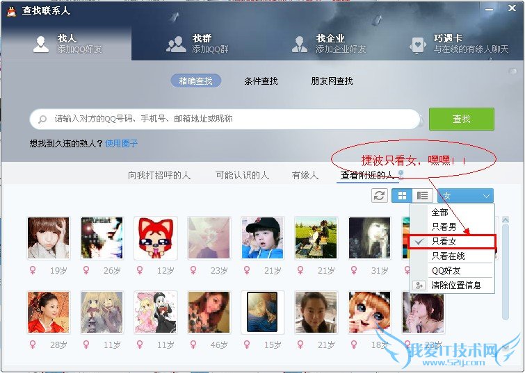 4.关键的一步:在“刷选”设置查找对象,有四个选项依次是:只看男、只看女、只看在线、qq好友。