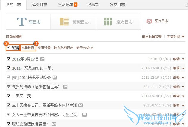 随着QQ空间日志功能不断的优化改进,目前QQ空间日志批量管理中已增加批量删除日志的功能: