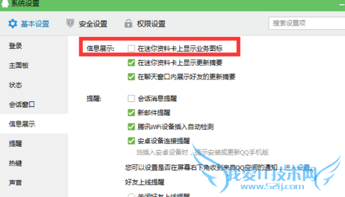 5、在打开的信息展示选项中,我们找到“在迷你资料卡上展示业务图标”选项。