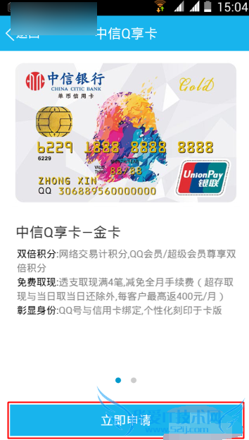 在界面的最下方,找到申请信用卡,就是我们Q享卡的申请入口了。授权进入到中信之后,阅读中信的协议,同意之后就可以选择卡片了。